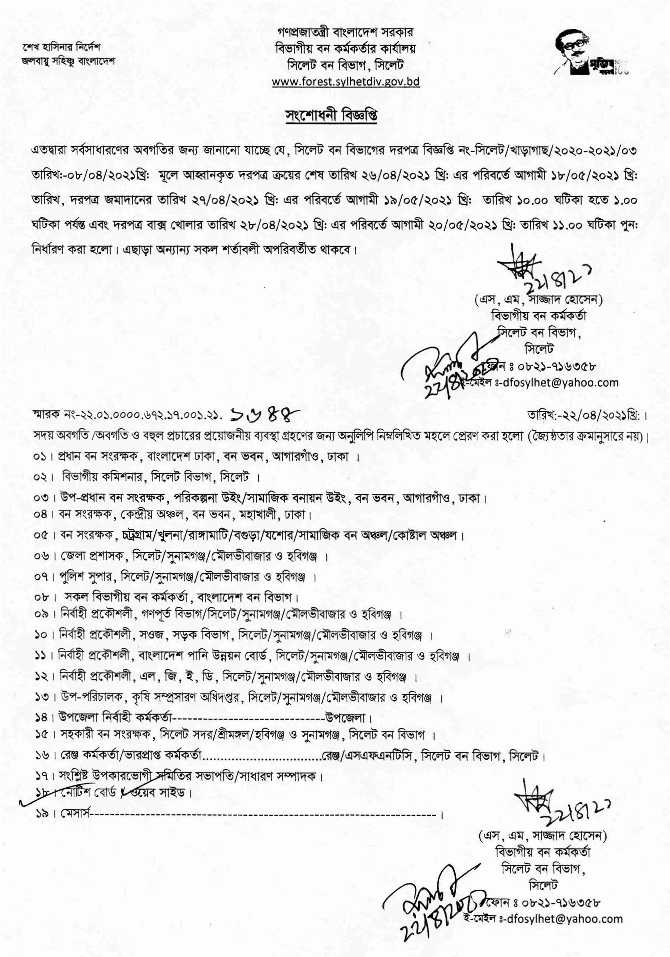 আহ্বানকৃত দরপত্রের সংশোধনী বিজ্ঞপ্তি