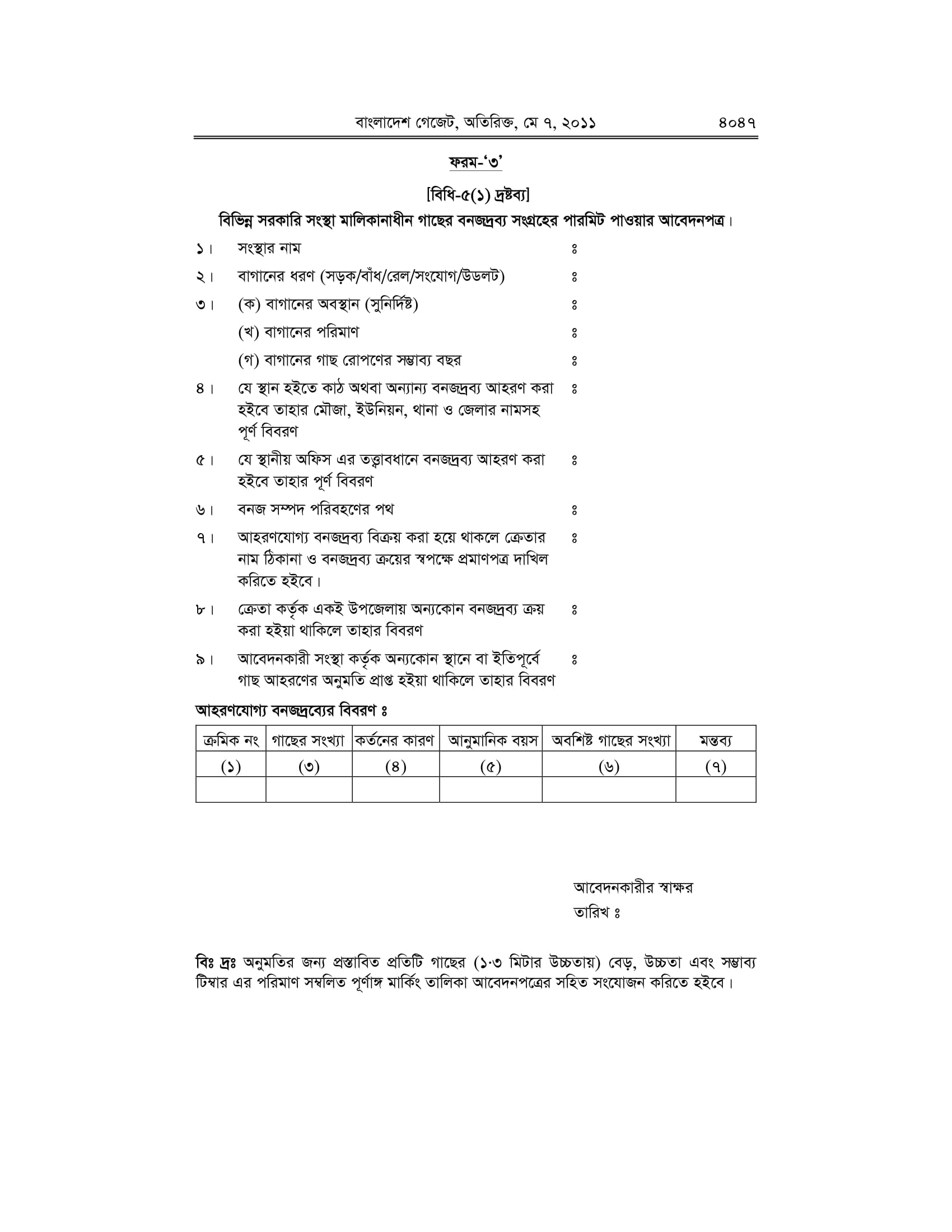 বিভিন্ন সরকারি সংস্থা মালিকানাধীন গাছের বনজদ্রব্য সংগ্রহের পারমিট পাওয়ার আবেদনপত্র