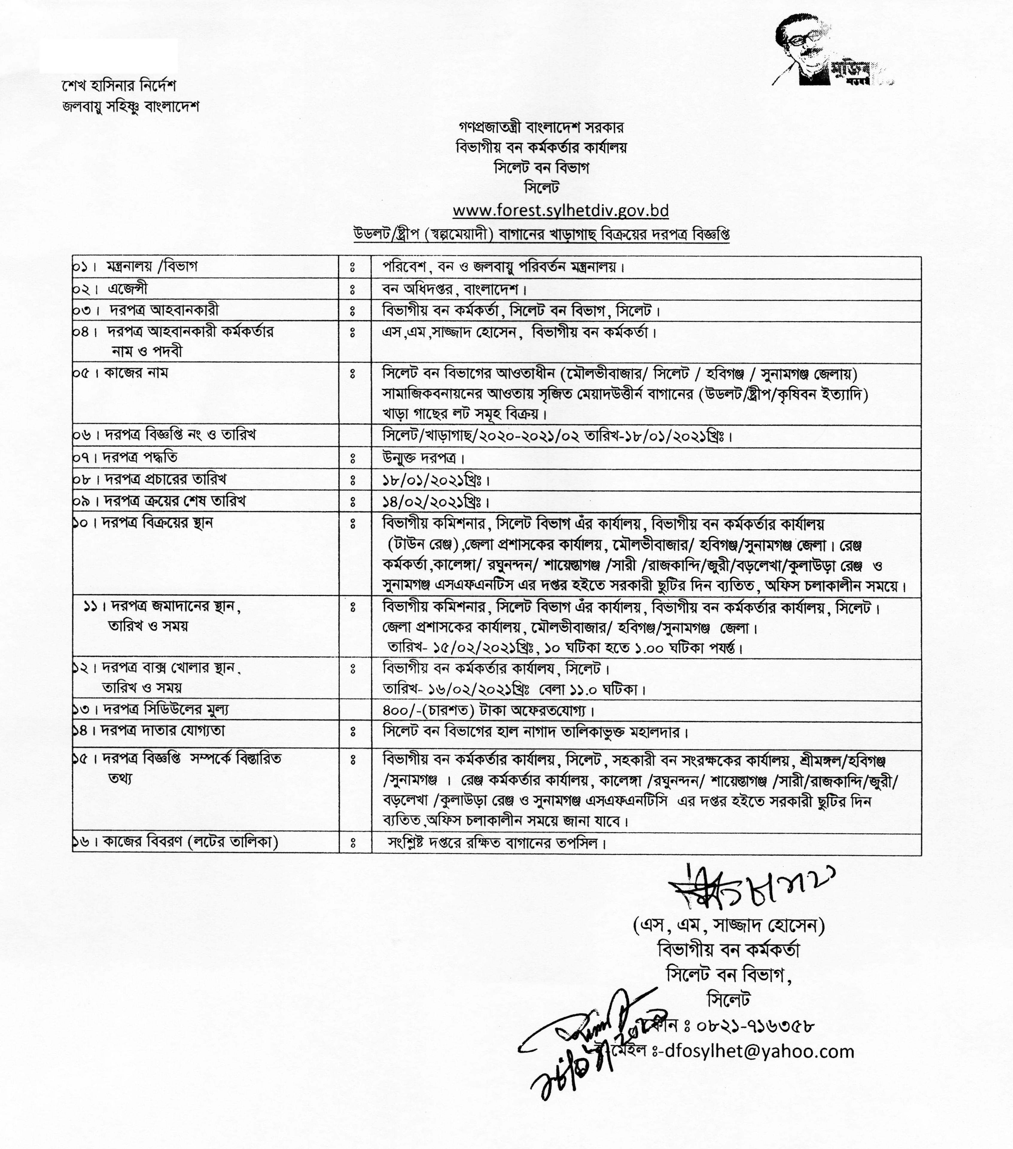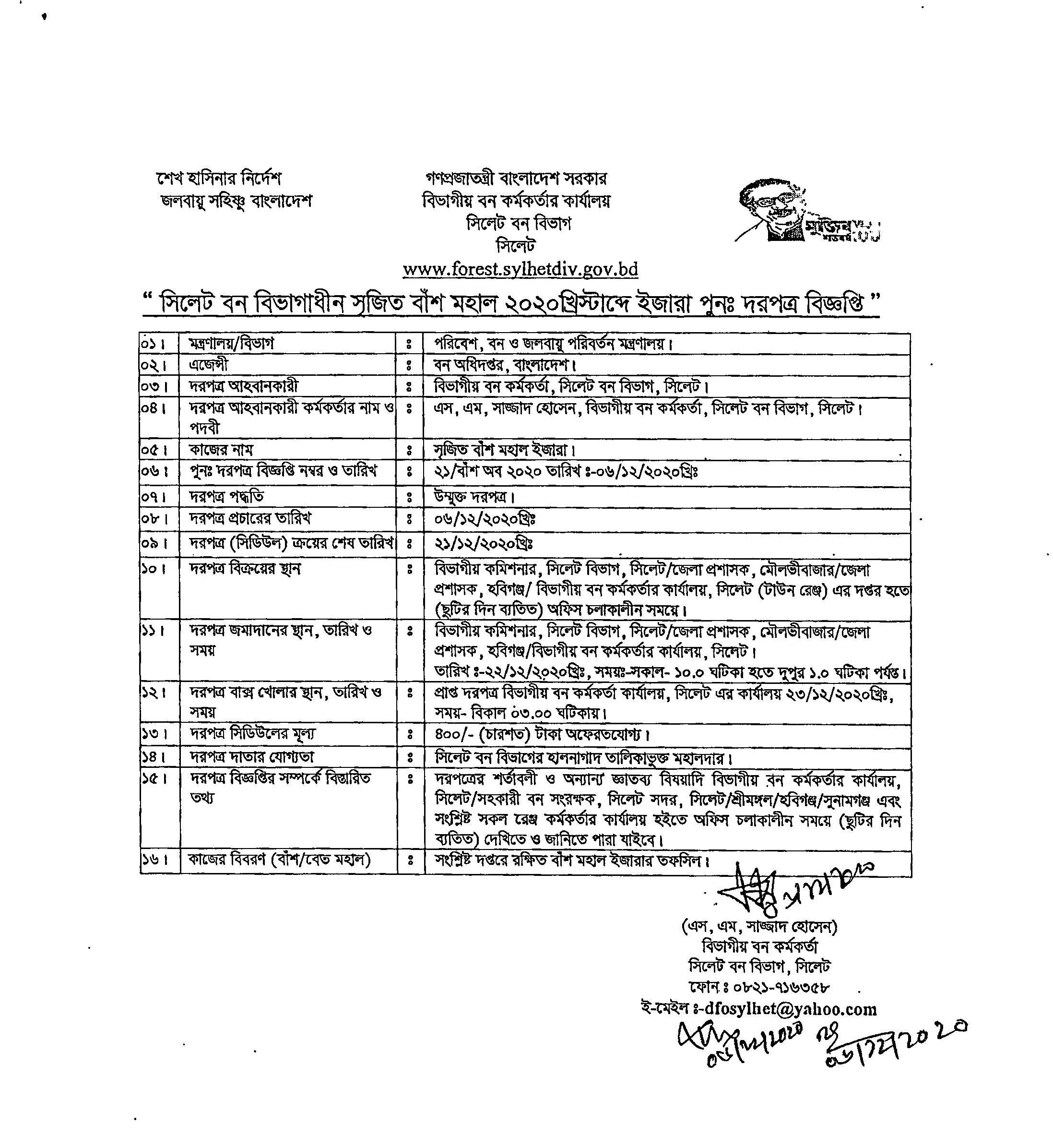 সিলেট বন বিভাগাধীন ২০২০খ্রিস্টাব্দে প্রাকৃতিক বাঁশ মহাল বিক্রয়ের পুনঃ দরপত্র বিজ্ঞপ্তি